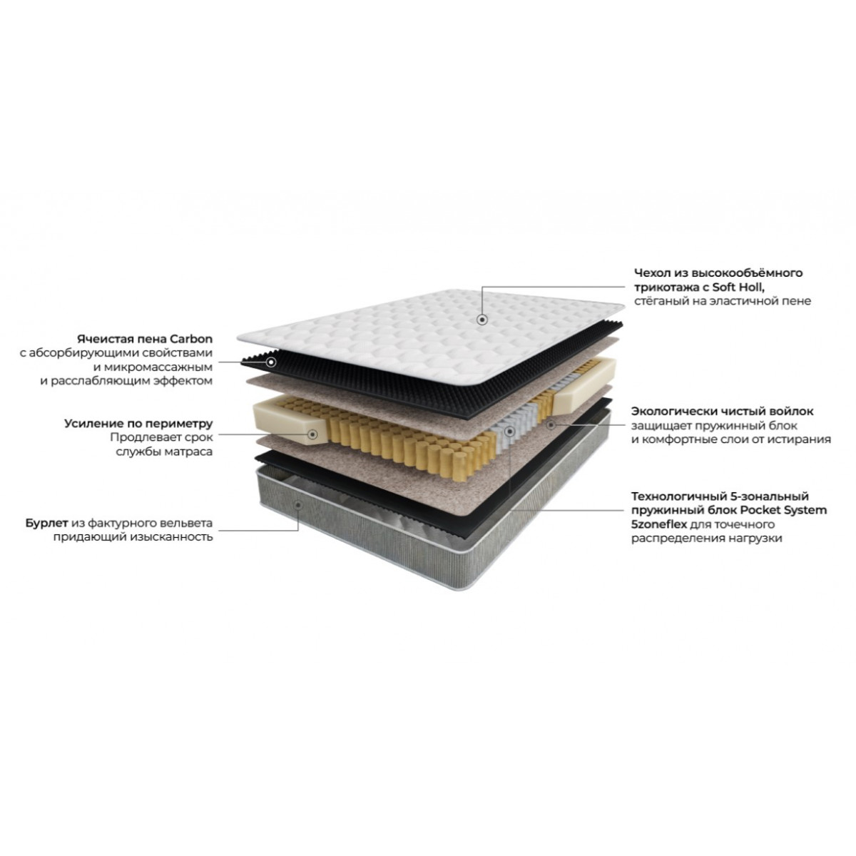 Технологичный 5-зональный пружинный блок Pocket System 5zoneflex служит опорой, обеспечивающей точечное распределение нагрузки, адаптируясь к особенностям каждой зоны тела. Это обеспечивает максимальный комфорт, снижая вероятность образования усталостных точек и поддерживая позвоночник в анатомически правильном положении.