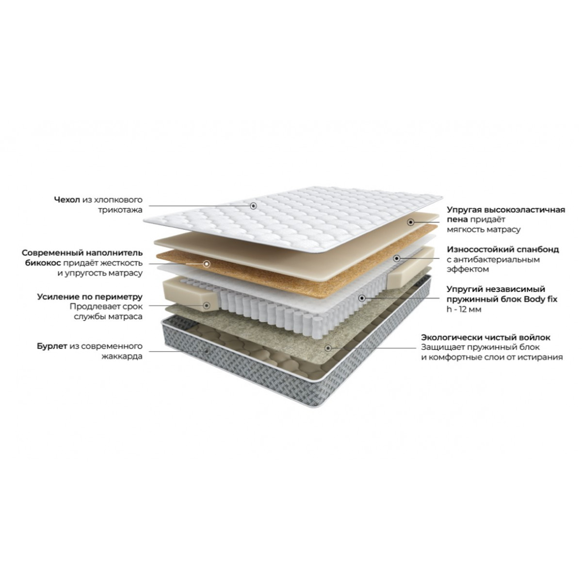 Современный наполнитель бикокос придает матрасу достаточную жесткость, необходимую для правильной поддержки позвоночника, одновременно сохраняя необходимую упругость.