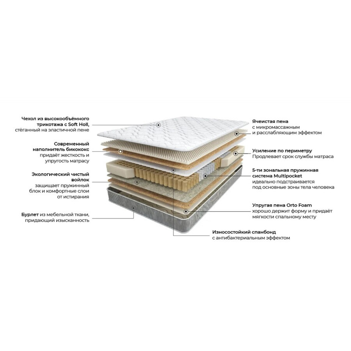 Ячеистая пена, Бикокос, Спанбонд, Пружинный блок, ППУ короб, Войлок, Упругая пена Orto Foam