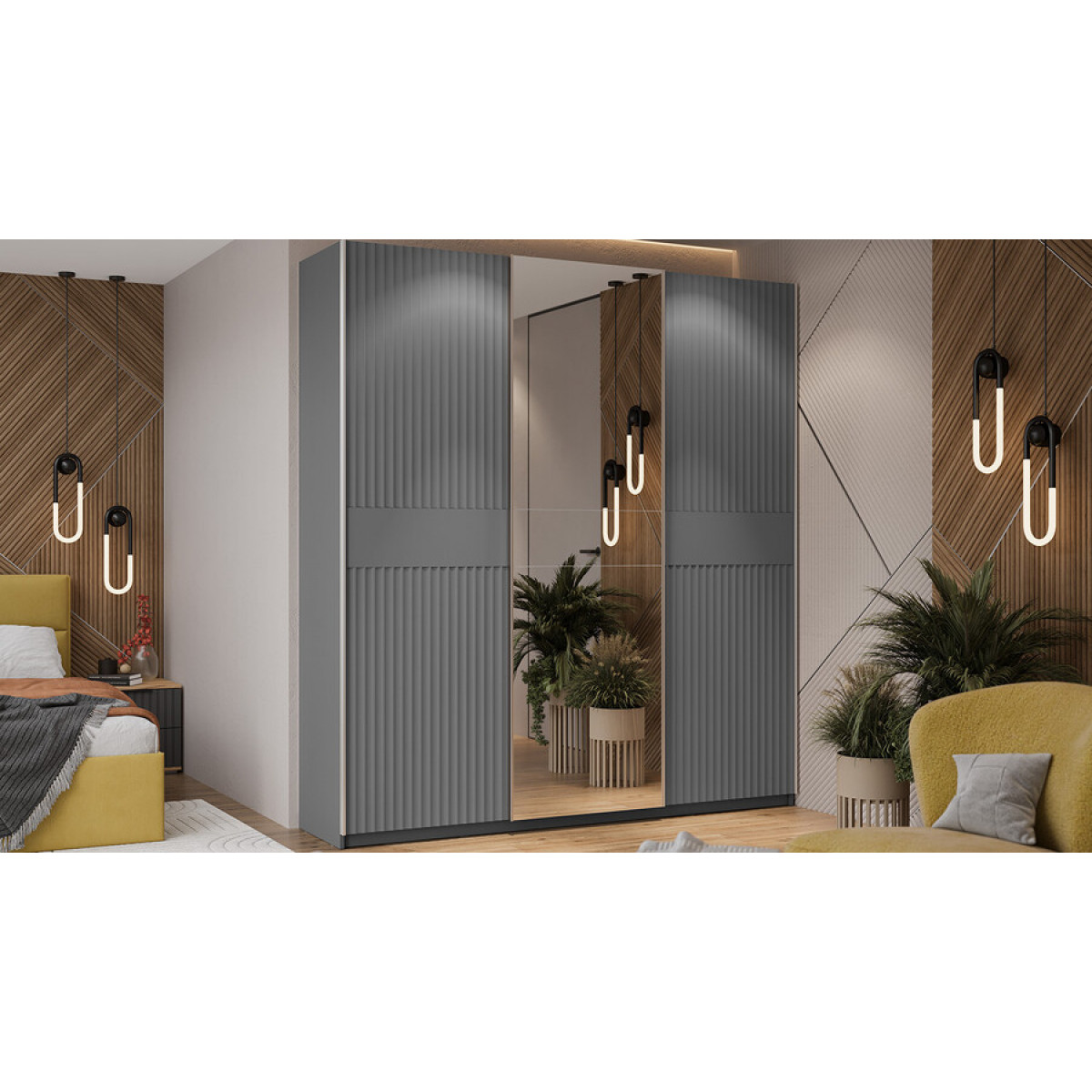 Шкаф-купе с 2 глухими и 1 зеркальной дверями «Оскар Тиффани» Тип 2 Ручка серебро, Серый графит, Графит матовый
