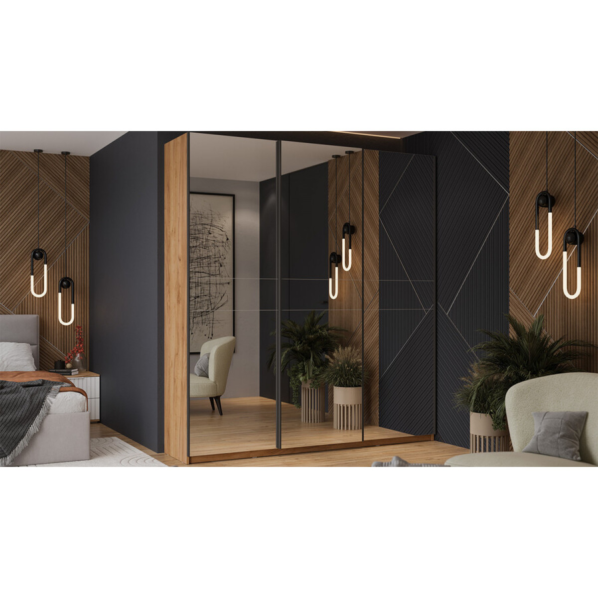 Шкаф-купе с 3 зеркальными дверями «Оскар» Тип 2 Ручка черная, Дуб Крафт золотой