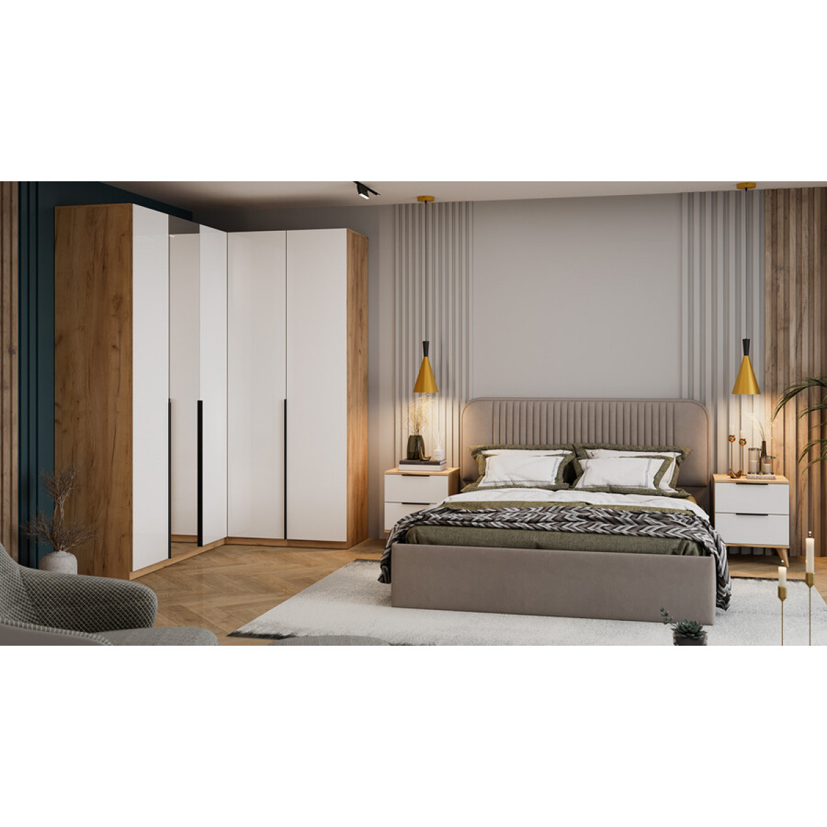 Спальный гарнитур «Джоли» №8 Бук матовый, Дуб Крафт золотой, Белый матовый