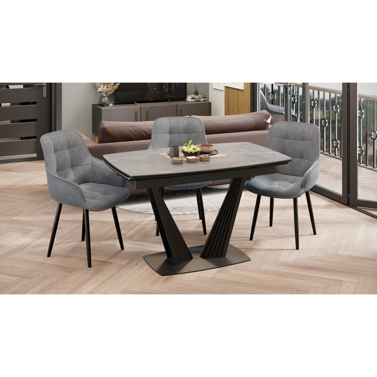 Стол раздвижной «Трэвис» Тип 1 Черный муар, Керамика матовая серый мрамор